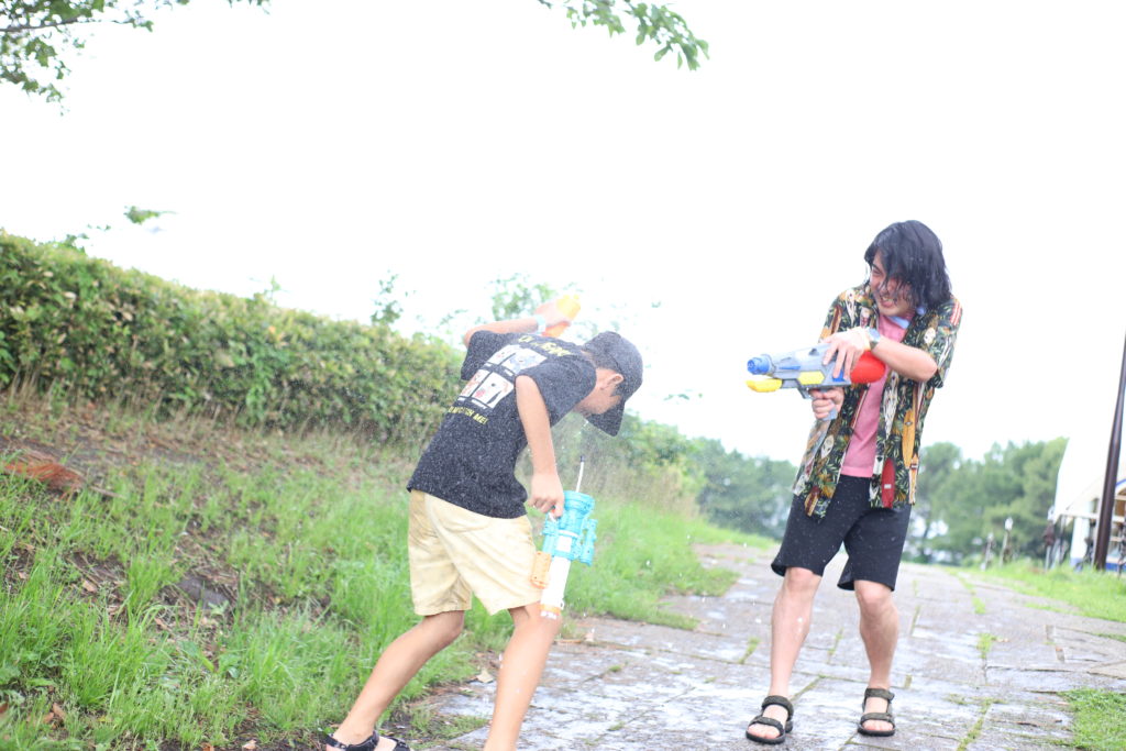 そしてKOWA BBQといえば、水遊び大会! 佐藤カメラマン自費の水鉄砲が子どもたちに配られます。