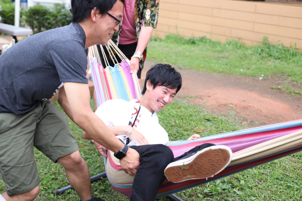 ハンモックでくつろいでいる肩上さんを揺らして落とそうとする近藤社長