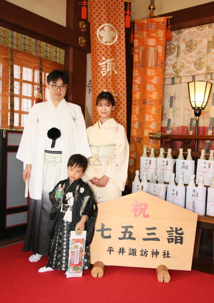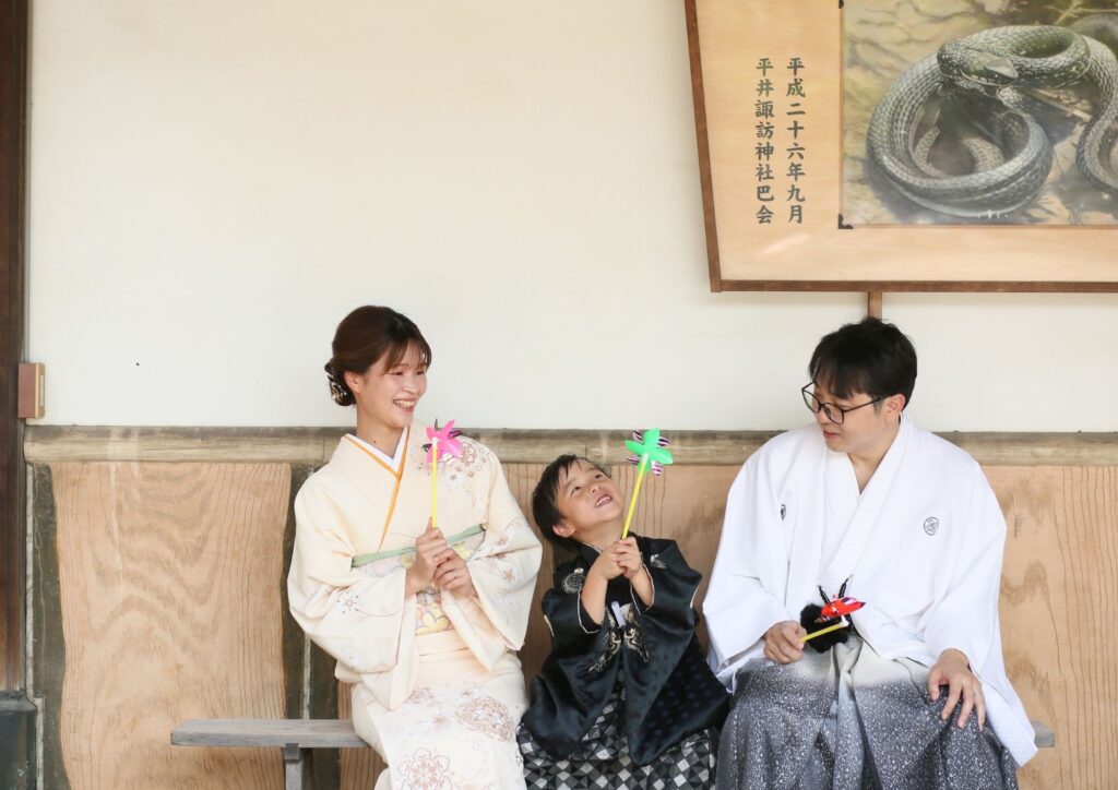 諏訪神社さんから千歳飴とお守りをもらい、中でもしっかりスタンダードなお写真をお撮りできます