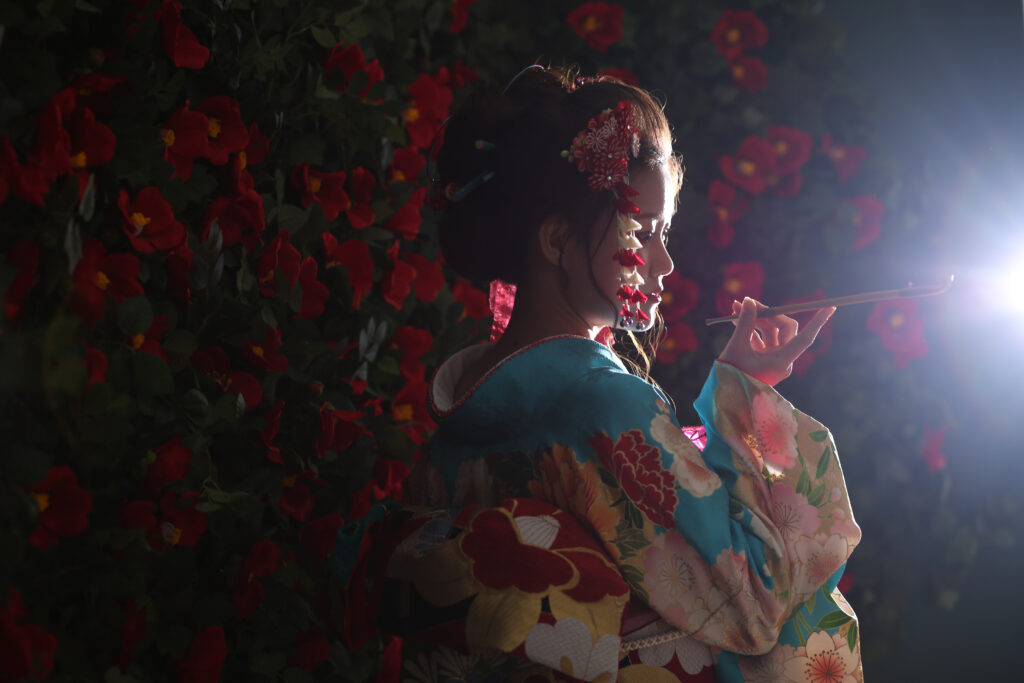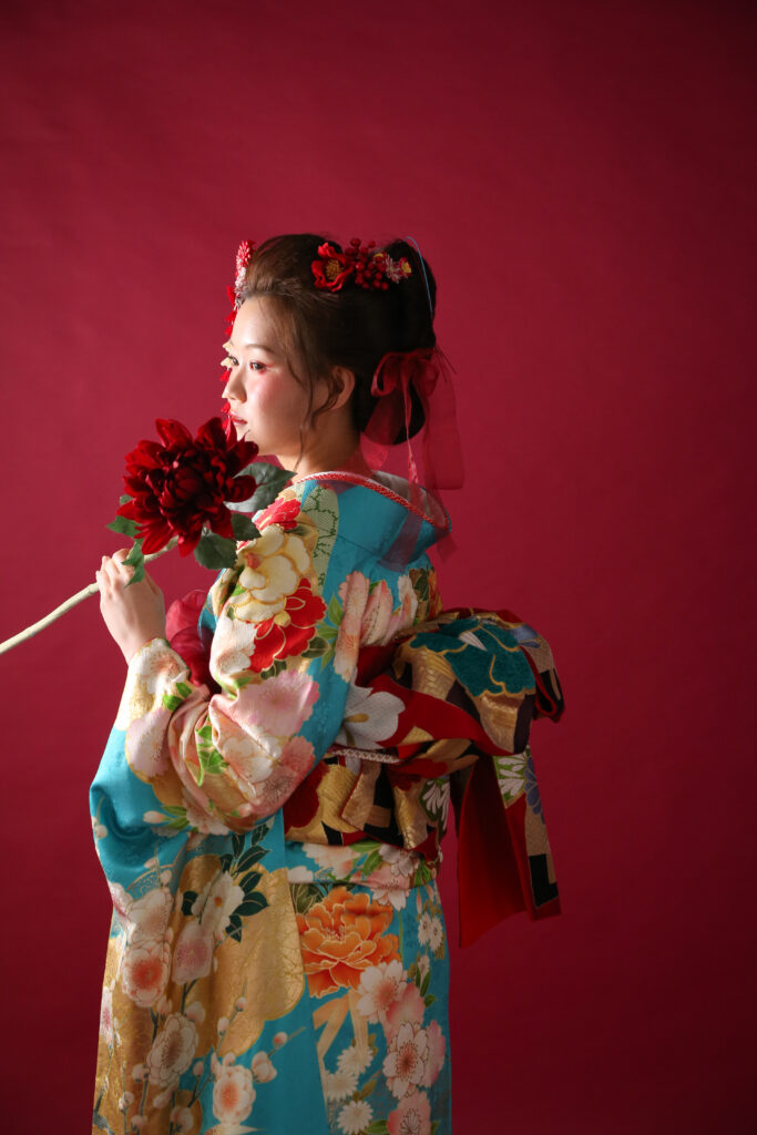 このお着物とスタイリングに合うように、かっこよく広告風に赤背景でお撮りさせいただきました