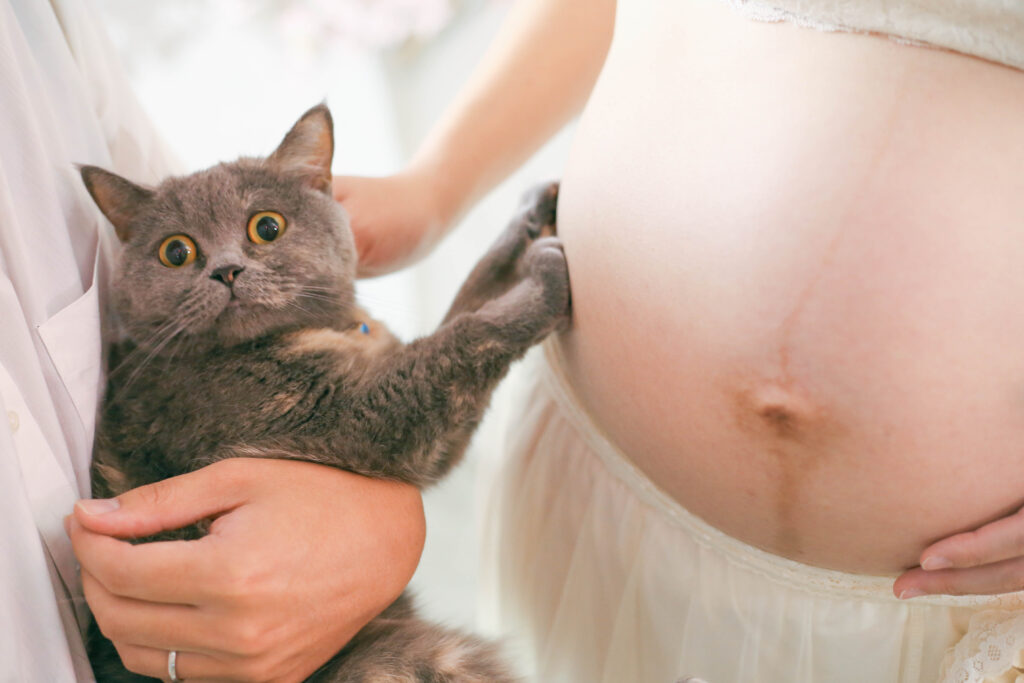 パパ抱っこでママのお腹に手を当ててくれているのも、猫ちゃんではかなりレアです…!!すごい!!