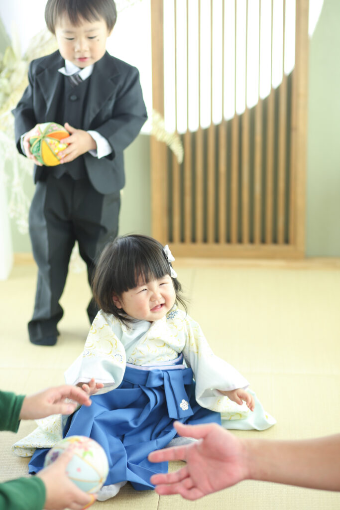現場はカオス!パパとママがボールで泣かないようにあやしてくれています(手前) 背景にお兄ちゃんも。笑