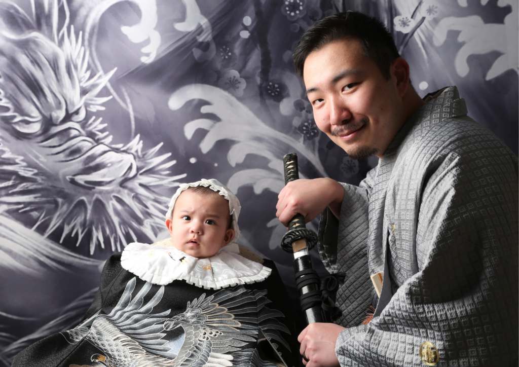 パパに用心棒風に刀を持ってもらい、より、いかつい写真を表現