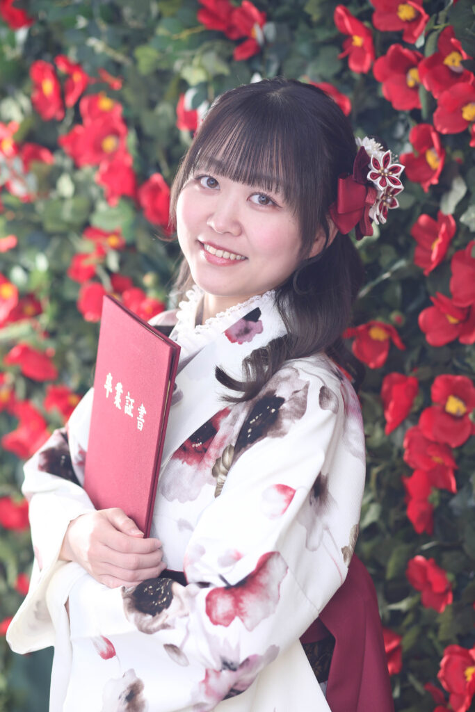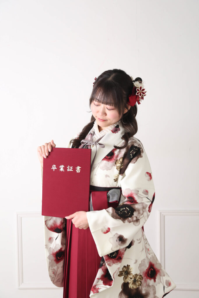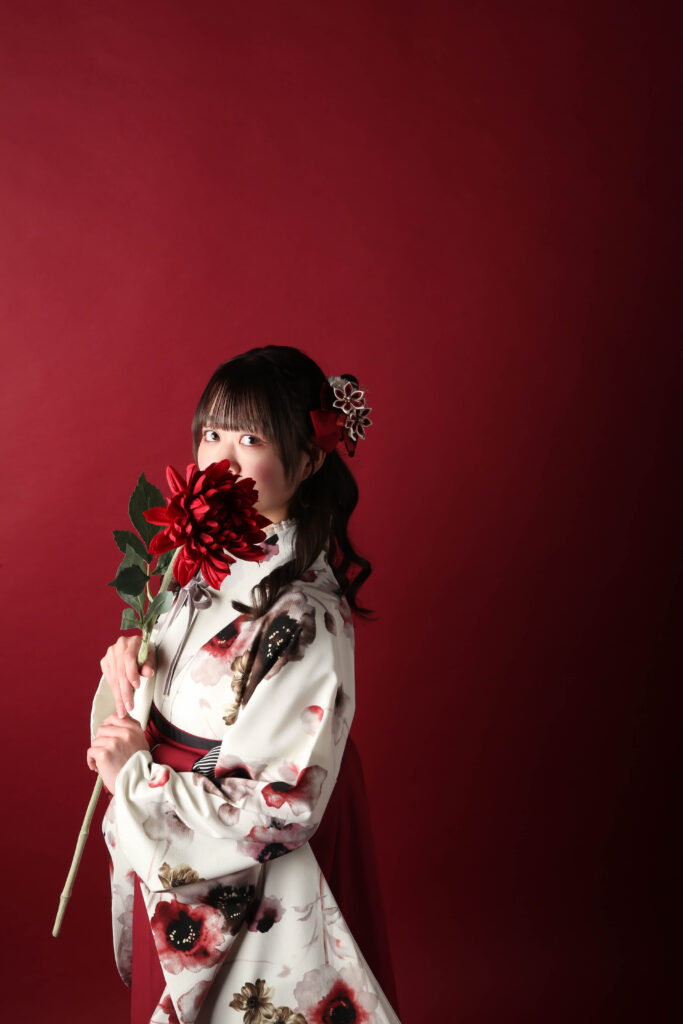 人気のアネモネのお着物。証書は小道具でご用意しております。