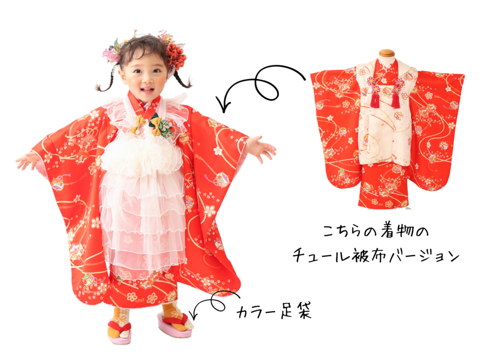 この王道のお着物もチュール被布と合わせると、これまた雰囲気が変わってカワイイ。