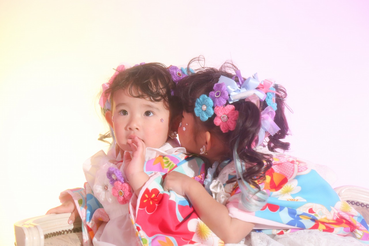 色違いのお揃いでかわいい。目元にキラキラシールを貼って、ご本人たちも嬉しそうでした😊