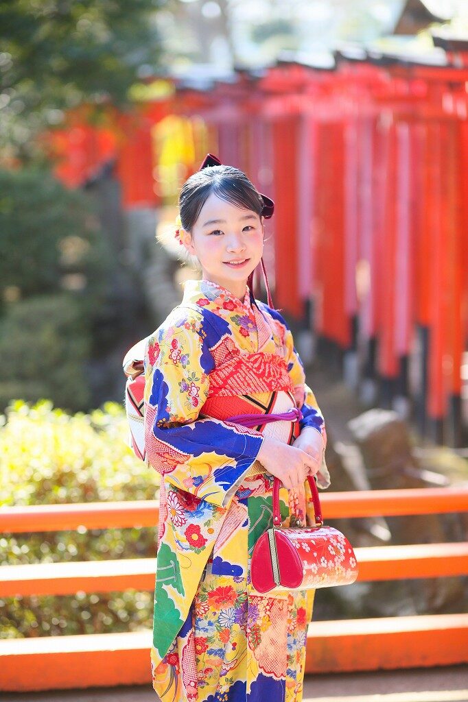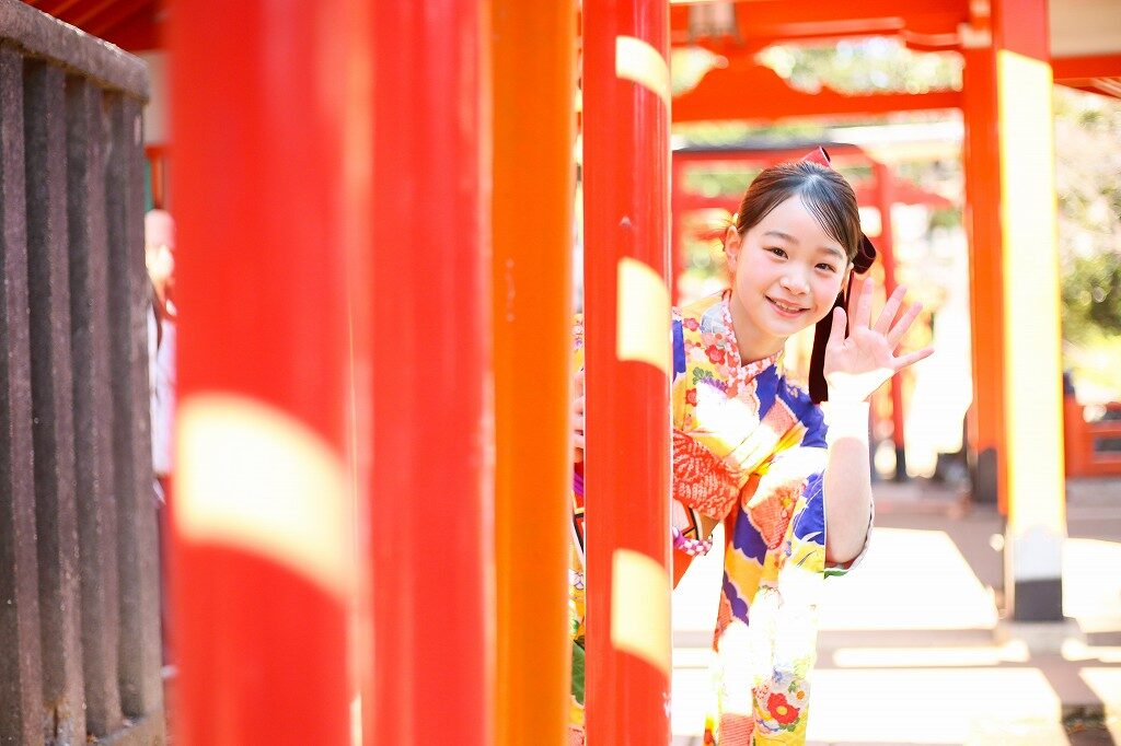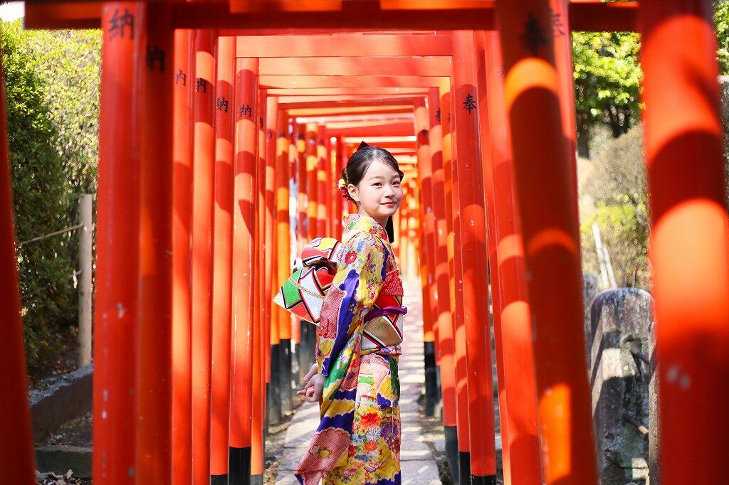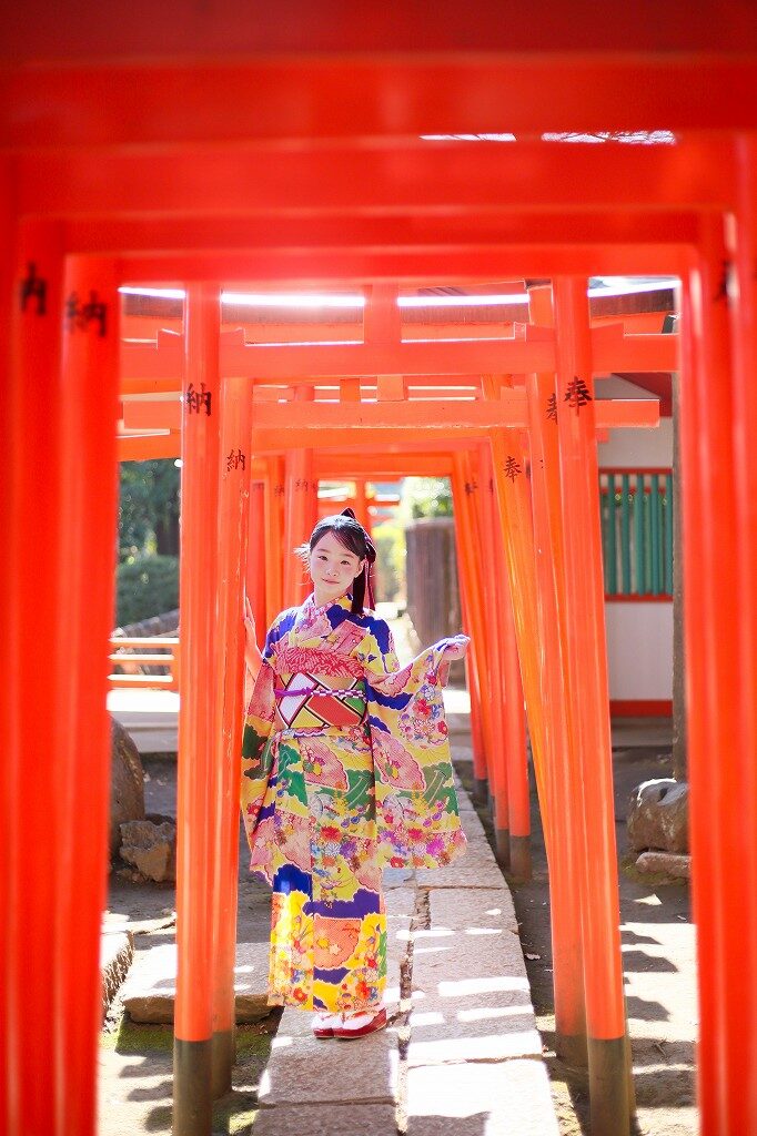 赤い鳥居に、着物姿が映えます。 もちろん、撮影中も神社参拝客のみんながお嬢様に釘付け。