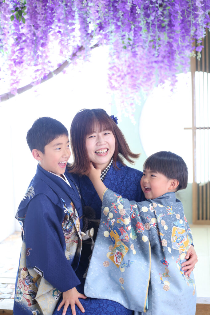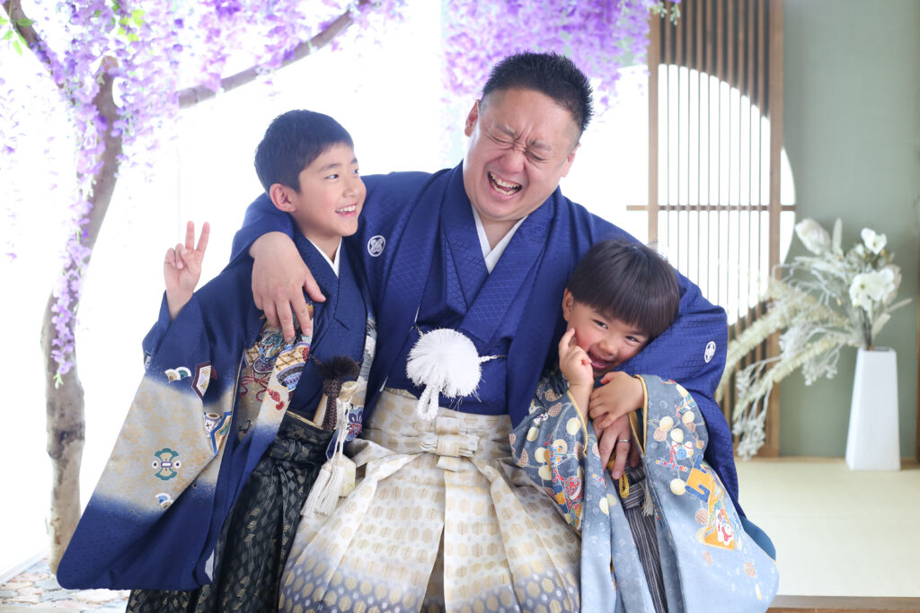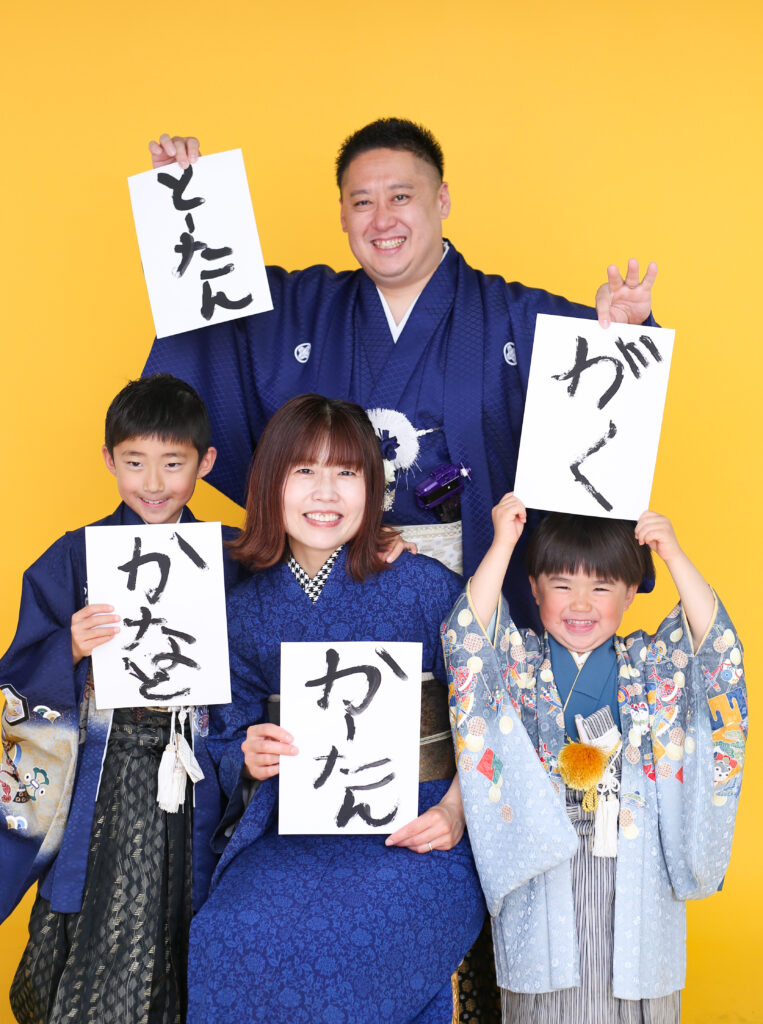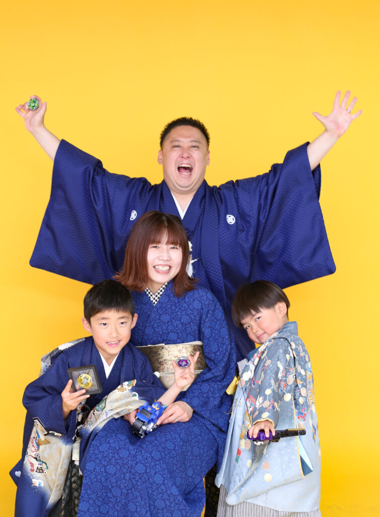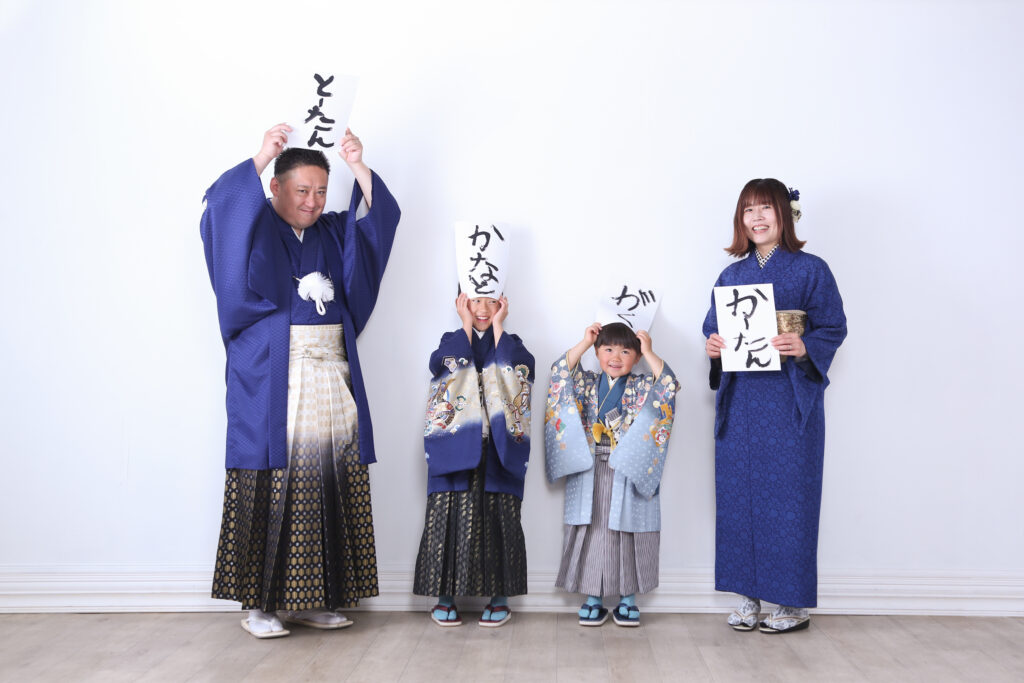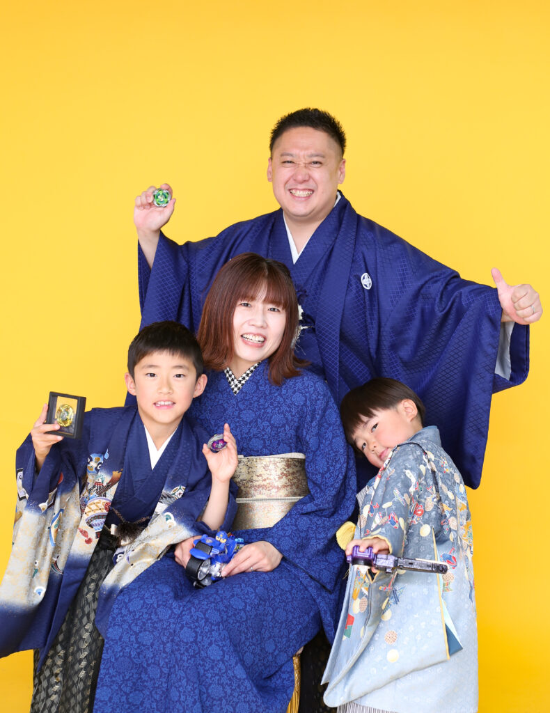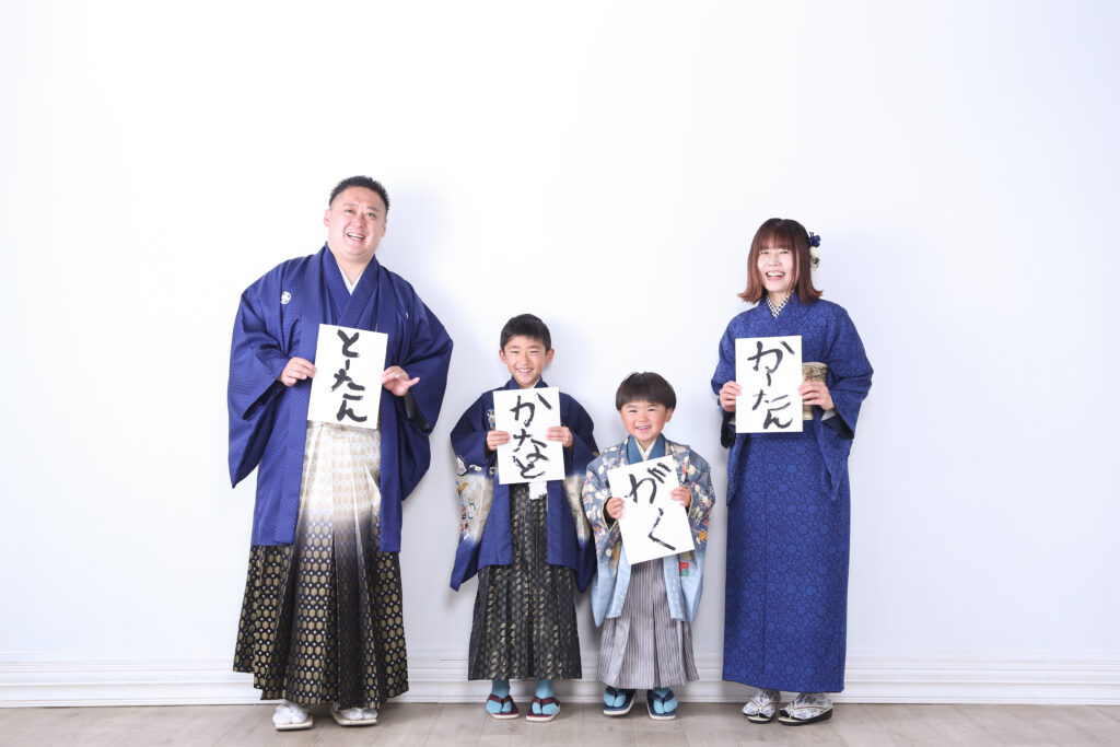 着物はみんな青系で統一。同系色の家族コーデも人気です♪