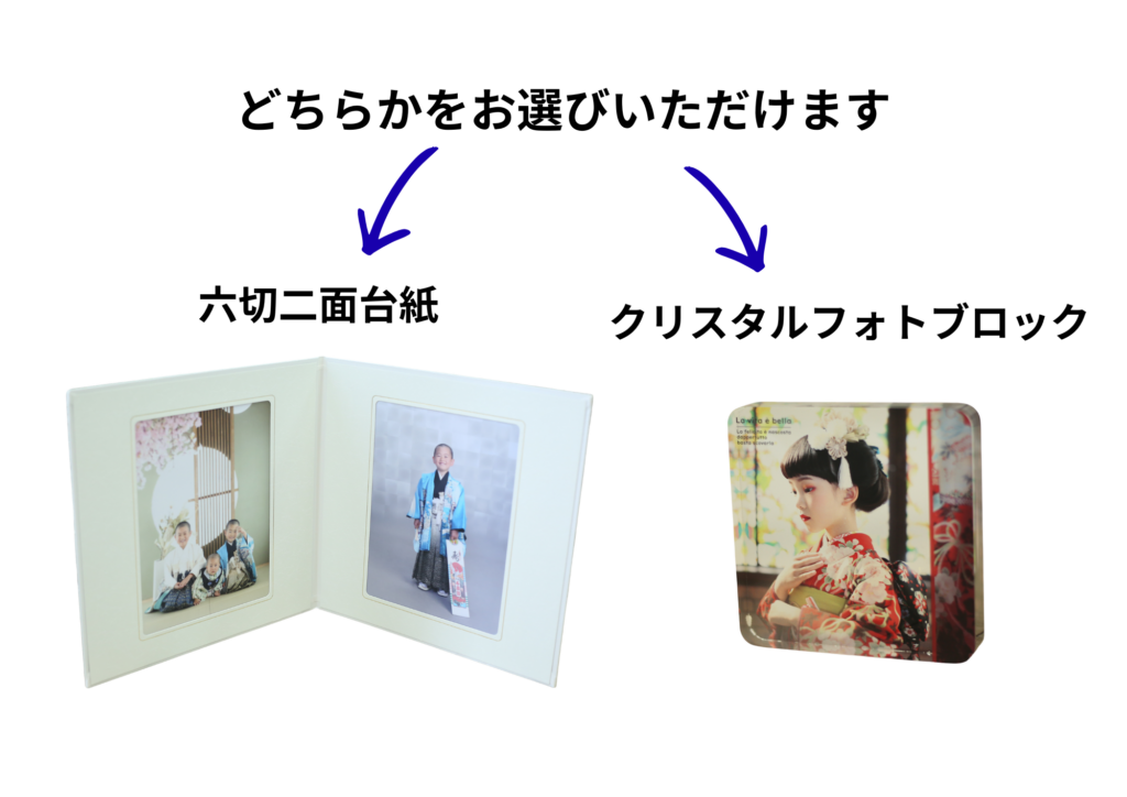 六切二面台紙かクリスタルフォトブロックのどちらかをお選びいただけます。