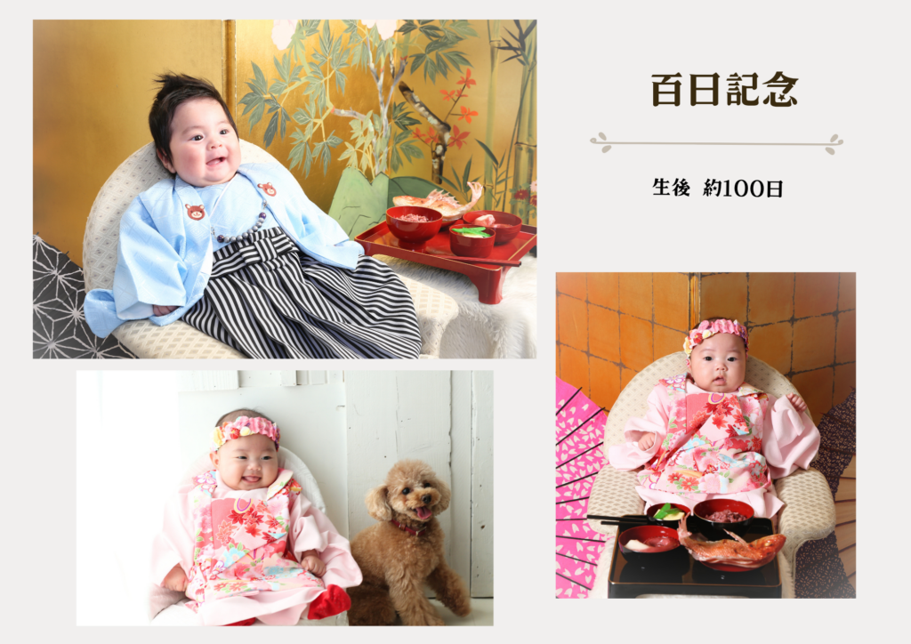 生後約100日のお祝い。お食い初めの写真を残すこともできます。