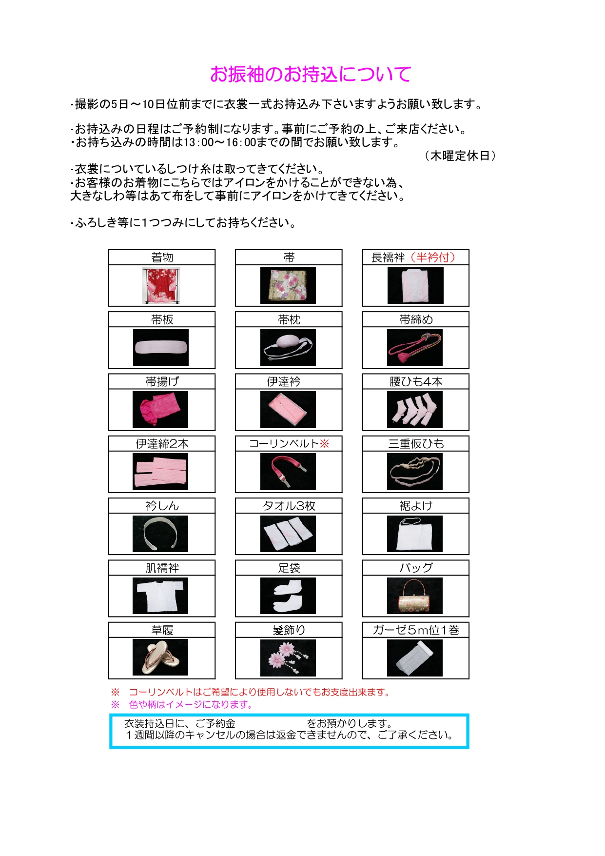 - 足袋・肌襦袢・裾よけの3点をご持参下さいませ。お持ちでない場合は、1,100円でまとめてレンタルも可能です。また、ヘアーセットが崩れないよう、前開きか後ろ開きの洋服でご来店下さいませ。